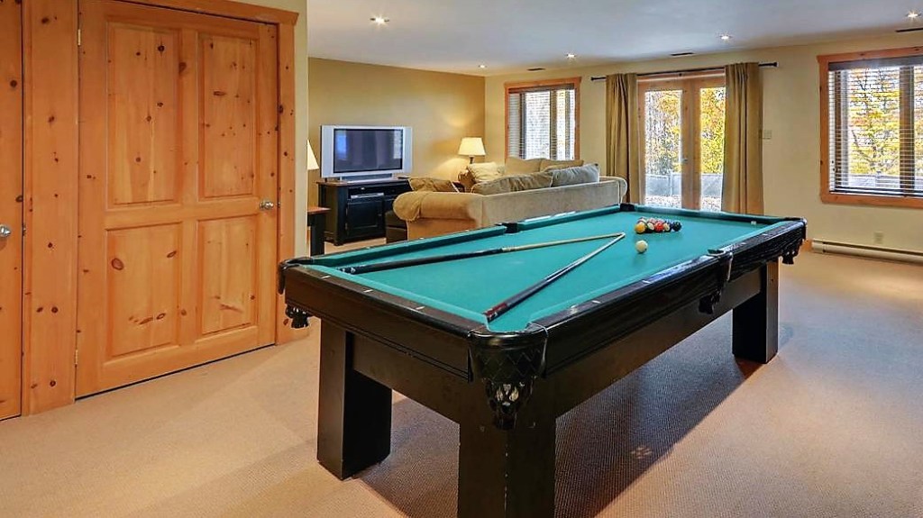 garden level: 1 bedroom with twin bed and a bunk bed in double/twin configuration, 1 Murphy bed and 1 sofa bed in the common area and a bathroom with a pool table