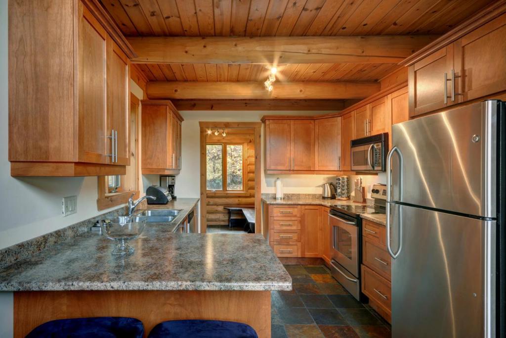 This chalet can accommodate up to 16 guests. You will find a natural stone fireplace overlooking the dining room and living room to enjoy the warmth of a wood fire. A door will take you to a private spa that is functional both summer and winter. The kitchen is equipped with everything you will need to prepare your meals.