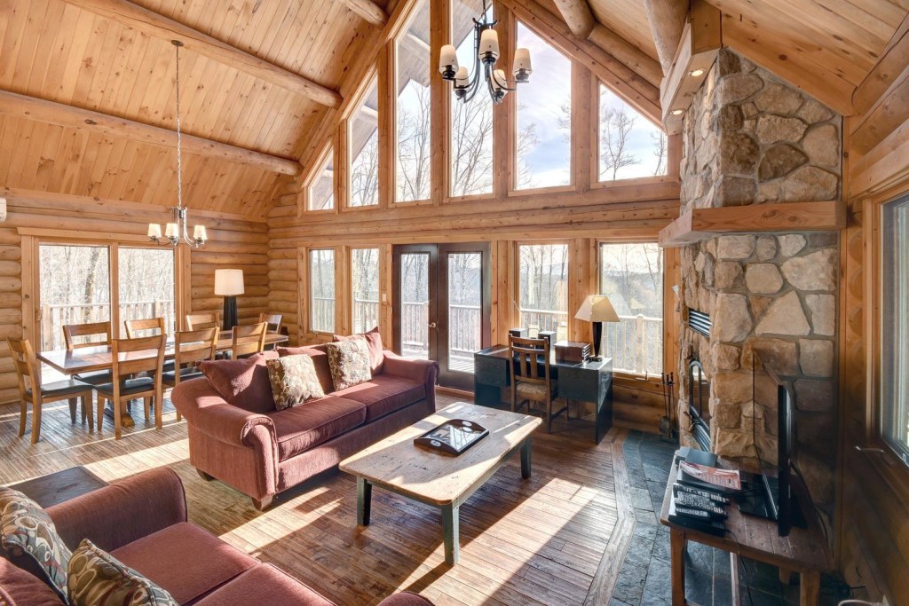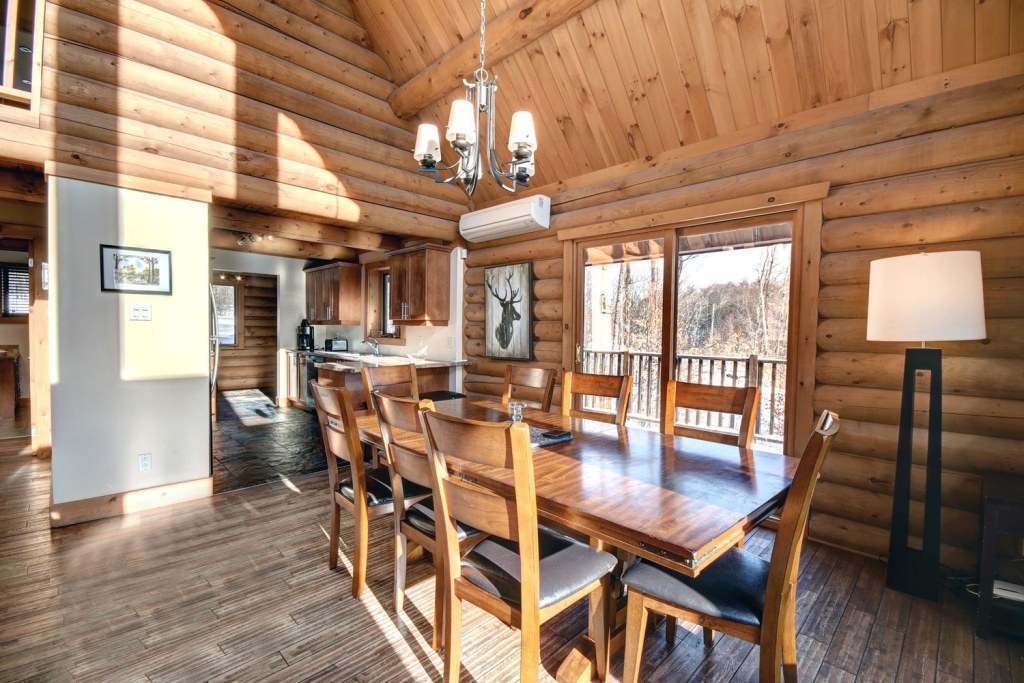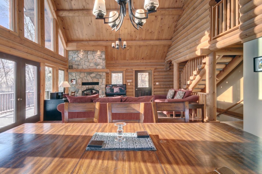 This beautifully landscaped cottage is a home made of round wood, with its cathedral ceilings its large floor-to-ceiling windows will provide you with natural daylight.