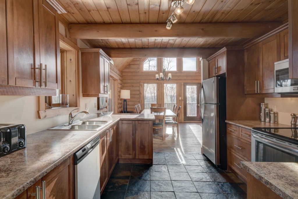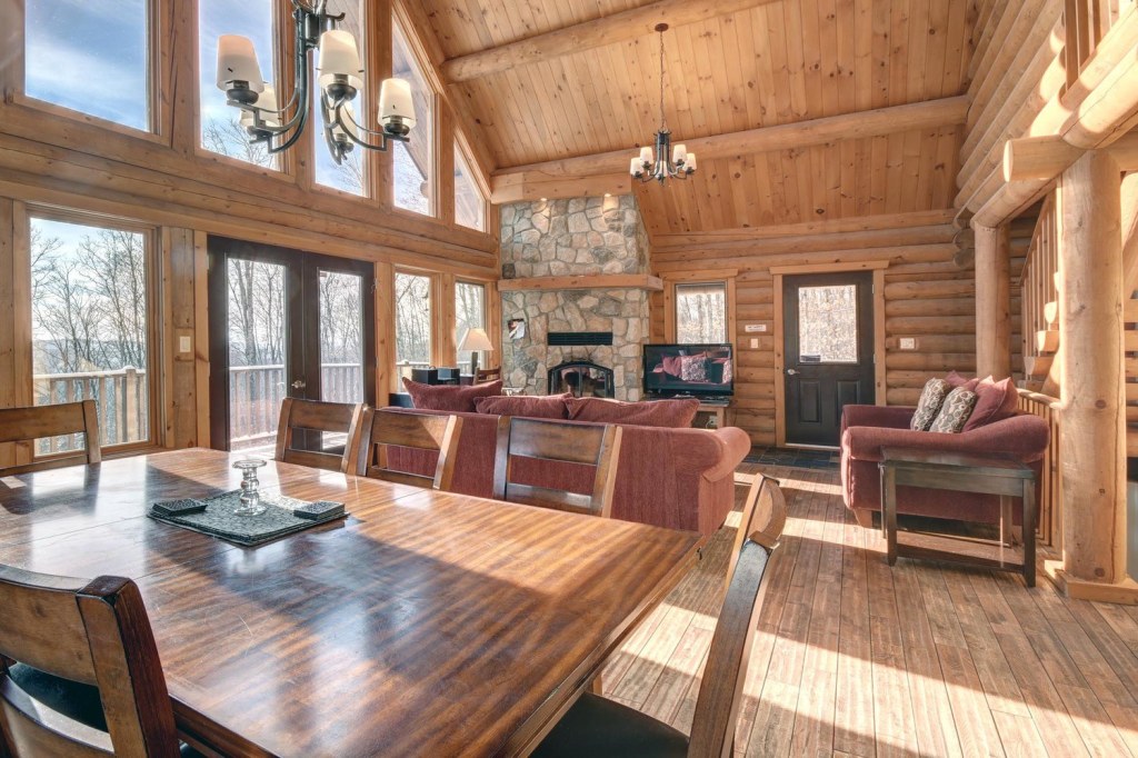 This chalet can accommodate up to 16 guests. You will find a natural stone fireplace overlooking the dining room and living room to enjoy the warmth of a wood fire. A door will take you to a private spa that is functional both summer and winter. The kitchen is equipped with everything you will need to prepare your meals.