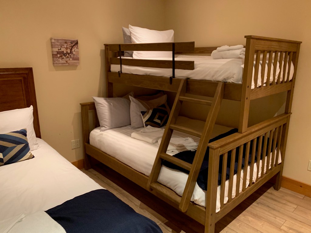 garden level: 1 bedroom with 1 queen bed and 1 bunk bed in twin/twin configuration, 2 Murphy chest bed queen in the common area and a bathroom with a pool table